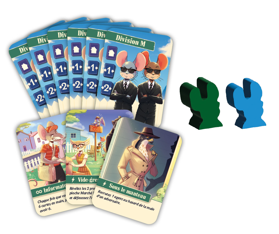 Agent Avenue – Division M est une extension passionnante, qui introduit un tout nouveau type d'agent : les souris de la Division M. Ces agents rusés créent une zone dangereuse autour de votre espace de jeu, ajoutant ainsi une nouvelle dimension stratégique, du suspense et du piquant à chaque partie d'Agent Avenue.