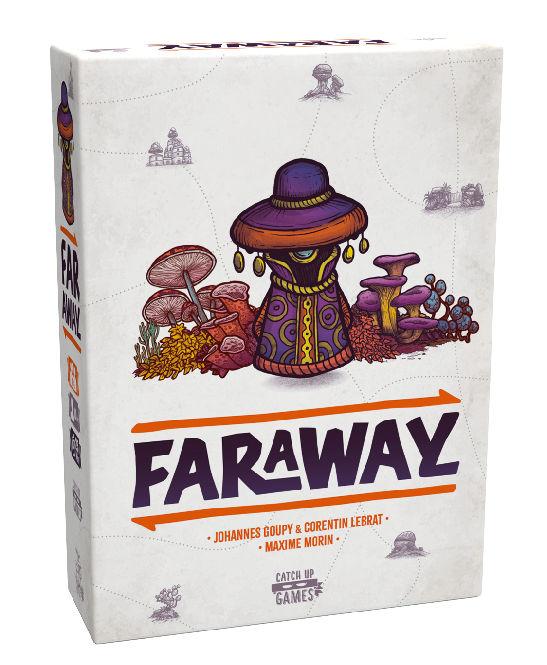 Dans une partie de Faraway, vous jouez 8 cartes devant vous, en une ligne de gauche à droite. Ces cartes représentent les régions que vous visitez lors de votre exploration. Chaque carte vous demande de remplir des conditions pour gagner des points de victoire. En fin de partie, vous réalisez le chemin de retour en comptant vos points dans le sens inverse de pose.